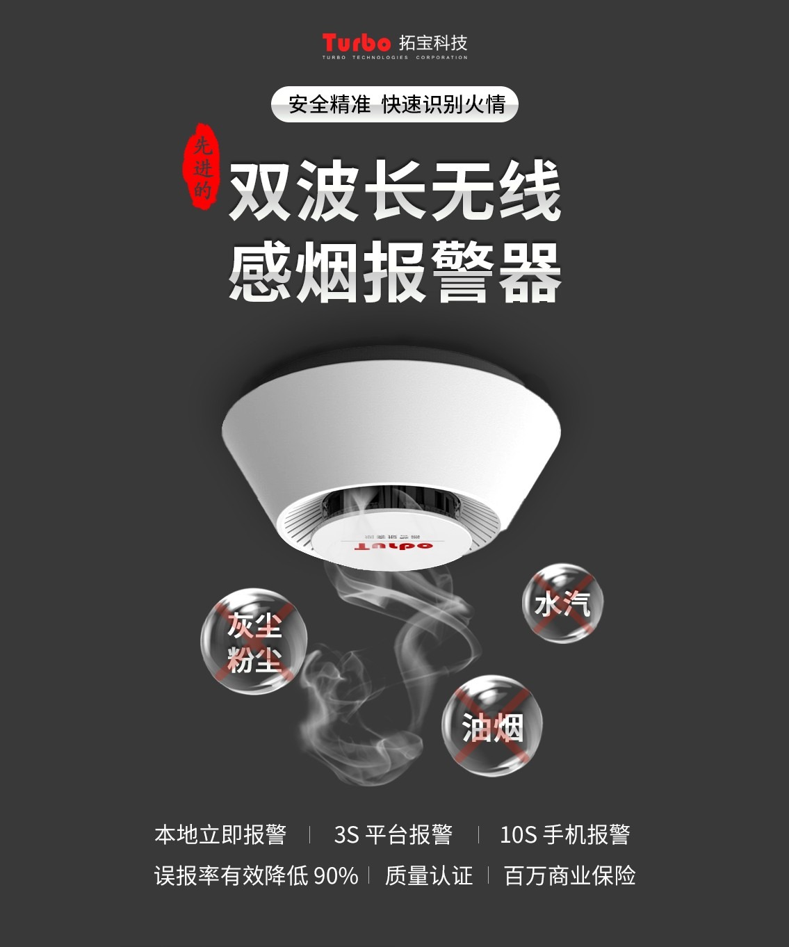 JTY-GD-TCN2010 雙波長(cháng)無(wú)線(xiàn)感煙報警器是采用一體式結構設計的無(wú)線(xiàn)感煙報警器,基于 LoRaWAN 無(wú)線(xiàn)標準,具備遠距離無(wú)線(xiàn)通信能力。為了降低誤報率,在不影響火災報警檢測靈敏度的基礎上,采用先進(jìn)的雙波長(cháng)檢測手段,能夠有效防止水霧、油霧以及大顆粒粉塵導致的誤報現象。當發(fā)生火災時(shí),報警器能探測煙霧,支持聲光報警,提示現場(chǎng)人員進(jìn)行滅火處理或逃生。報警器可以檢測電池低電量、光電發(fā)射故障、無(wú)線(xiàn)通訊故障等,支持聲光報警器提示。同時(shí),可以將火災報警信息、設備故障信息等通過(guò)無(wú)線(xiàn)方式實(shí)時(shí)地上報到遠端消防平臺,方便遠程監控火情和維護設備。